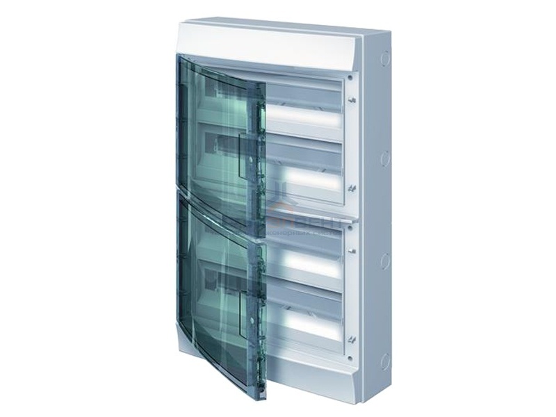 Бокс ABB EUROPA в нишу 8М с дверцей белый Шкаф настенного монтажа с клеммным блоком фирмы ABB серии Mistral65 (IP65) на 72 модуля с зеленой прозрачной дверцей